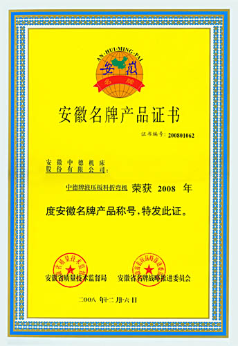 中德牌液壓板料折彎機(jī)喜獲2008年“安徽省名牌產(chǎn)品”的殊榮,這是繼2005年中德牌液壓擺式剪板機(jī)獲“安徽名牌產(chǎn)品”之后,中德機(jī)床的質(zhì)量和信譽(yù)又一次獲得認(rèn)可。與此同時,中德牌液壓擺式剪板機(jī)也順利通過安徽名牌產(chǎn)品的復(fù)審,證書的有效期將延長至2013年。